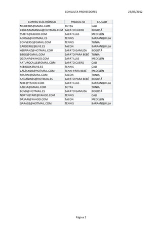 The document lists 20 shoe suppliers with their codes, names, contact information, emails, products, and cities. It includes details like the supplier's NIT number, phone number, address, email, type of product supplied, and location city. The suppliers offer a variety of shoe types including boots, leather shoes, sneakers, heels, baby shoes, and more.