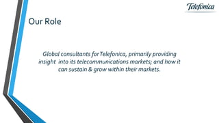Telefonica operates as a multinational telecommunications company providing services across Europe and South America. The consultants analyzed Telefonica's business environment, culture, and strategy. They found that Telefonica has a strong brand but faces challenges from political instability in key markets like the UK. The consultants recommend that Telefonica focus on innovation, exploit new opportunities in data and business services, and better tailor customer service to sustain its competitive advantage globally.