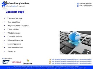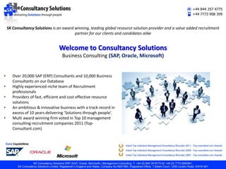 SK Consultancy Solutions is an award-winning global recruitment firm specializing in SAP, Oracle, and management consulting talent. They have over 20,000 SAP consultants and 10,000 business consultants in their database. They provide fast, efficient, and cost-effective recruitment solutions through a consultative approach and extensive experience recruiting niche technical and functional consulting talent.