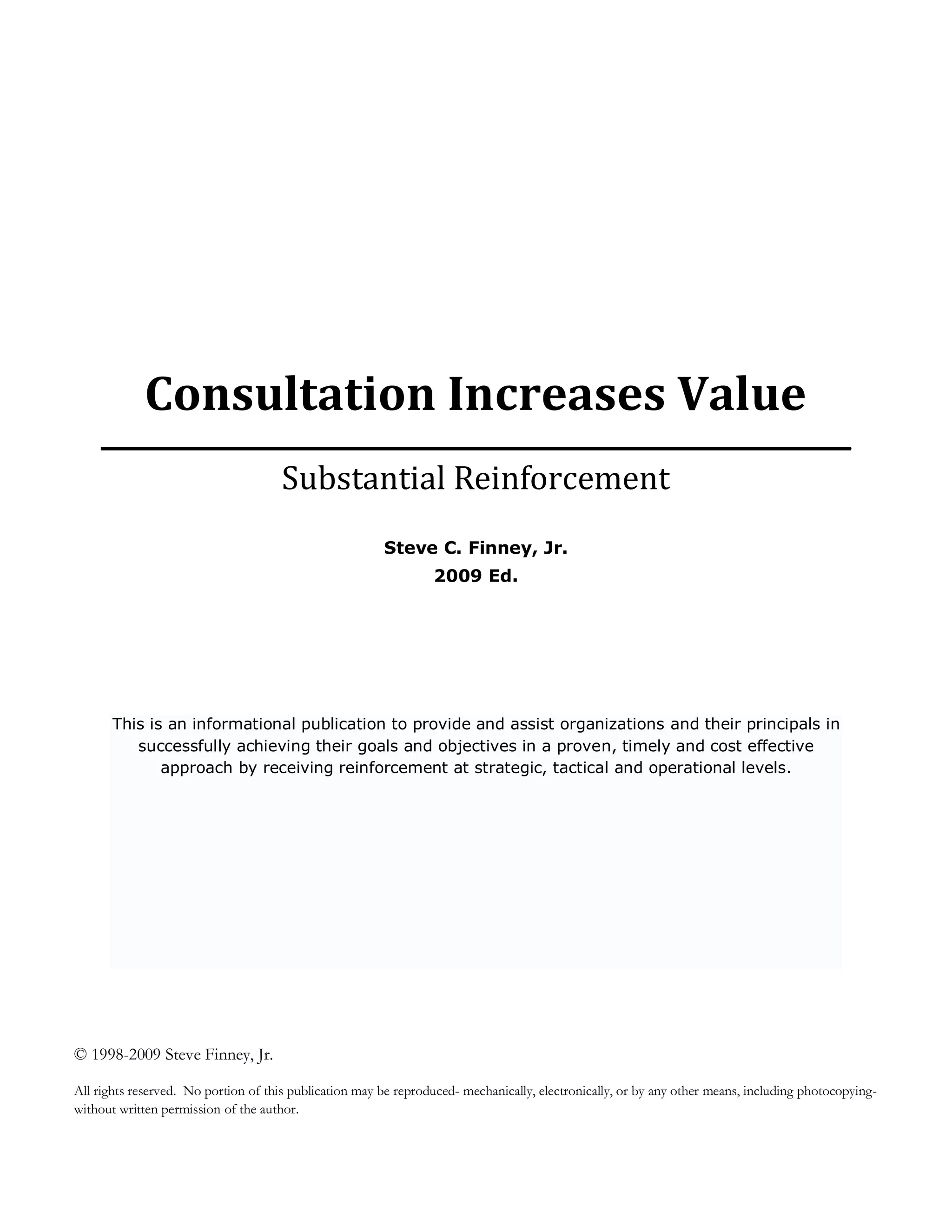 This document discusses the value that consultants can provide to organizations through strategic consultation at various levels. It distinguishes between generalist consultants, who take an interdisciplinary approach and provide guidance across multiple areas, and specialist consultants, who focus on a specific field or area of expertise. The key benefits of generalist consultants highlighted are their ability to take a holistic view, provide objective feedback, and reduce the need for multiple specialist consultants. Both internal and external consultants each have advantages, with the optimal approach depending on an organization's unique needs and goals. Overall, the document argues that consultation can significantly increase an organization's ability to achieve its objectives in an effective and timely manner.