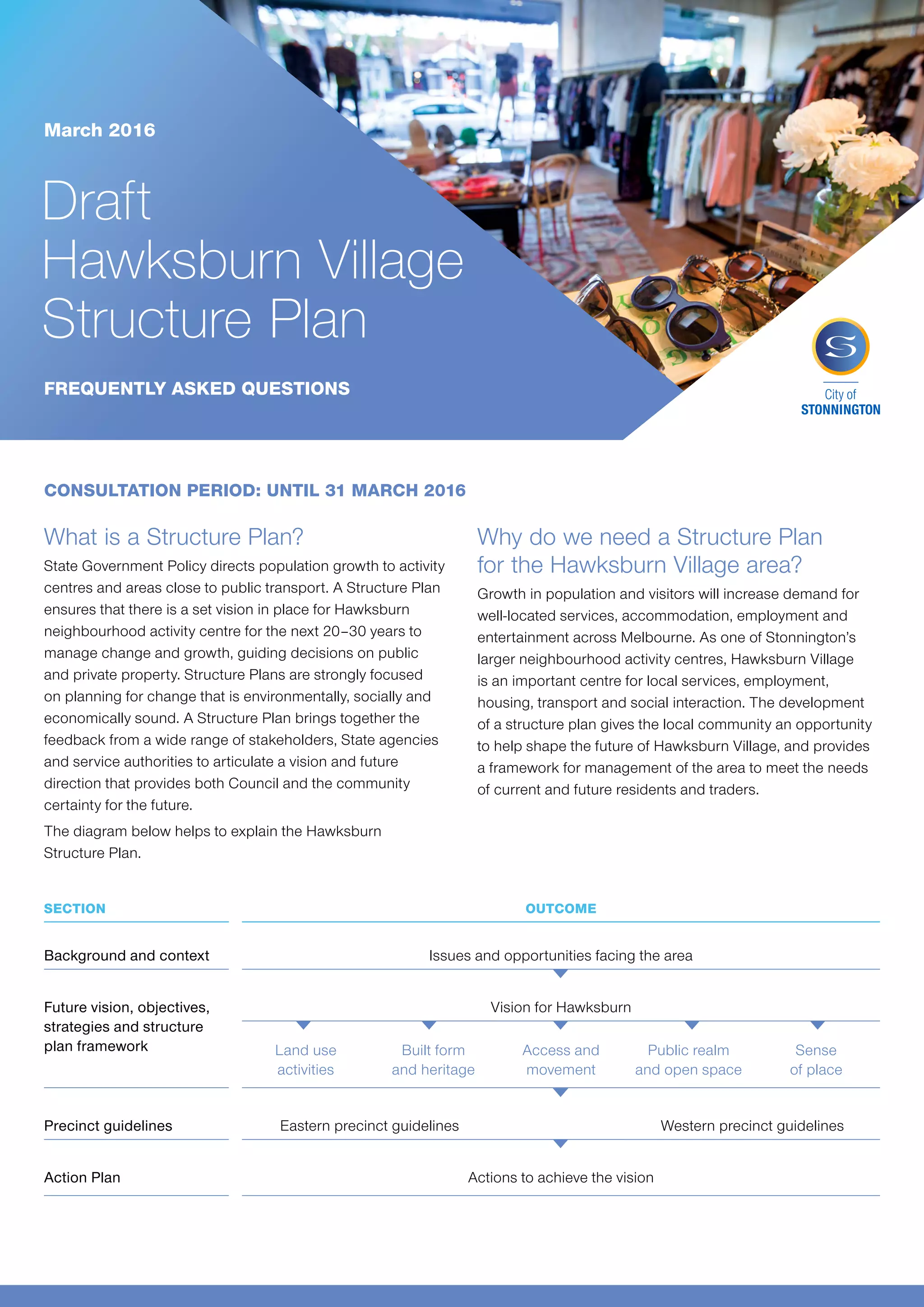 The document discusses a Structure Plan that is being developed for Hawksburn neighborhood activity centre over the next 20-30 years. A Structure Plan provides a vision and framework to guide development and manage growth, drawing on feedback from stakeholders. It ensures strategic decisions around land use, activities, built form, access, public spaces and sense of place. The draft Hawksburn Structure Plan was developed through community consultation, and further input is being sought to refine it before finalization.