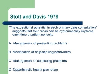 - Stott and Davis (1979) suggest exploring four areas in each consultation: managing presenting problems, modifying help-seeking behaviors, managing continuing problems, and opportunistic health promotion.