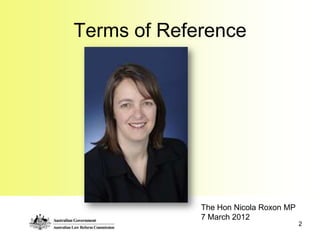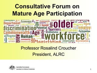 The document outlines the terms of reference for the Consultative Forum on Mature Age Participation, which is tasked with identifying Commonwealth laws and legal frameworks that create barriers for older persons participating in the workforce or other productive work, and changes that could be made to remove such barriers. It provides details on the objective, focus, examples of relevant laws, inquiry team and process, and ways for stakeholders to engage and provide input.