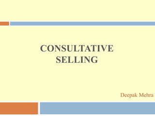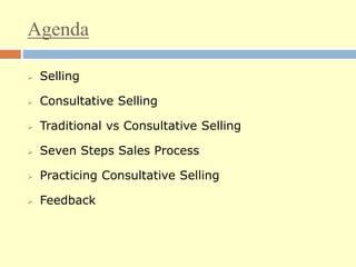 The document outlines a consultative selling approach that emphasizes understanding customer needs and building rapport through a structured seven-step sales process. Key steps include establishing trust, identifying customer pain points, discussing budget and decision-making processes, and ensuring effective communication post-sale. Ultimately, the goal is to provide tailored solutions that address specific customer challenges for mutual benefit.