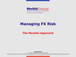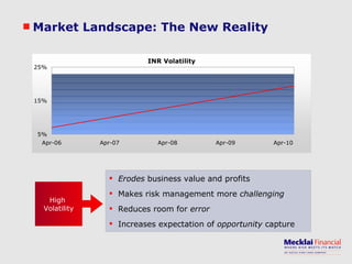 The document discusses managing foreign exchange risk and Mecklai's approach. It outlines the challenges of high volatility in markets and impacts on businesses. Traditional risk management approaches are discussed along with their pros and cons. Mecklai's approach focuses first on understanding the business risks and exposures before developing hedge strategies aligned to the business. The approach involves quantifying exposures, defining risk appetite and target rates, and monitoring hedge strategies. Mecklai works with clients to devise risk management policies, implement automated systems, and provide ongoing support.