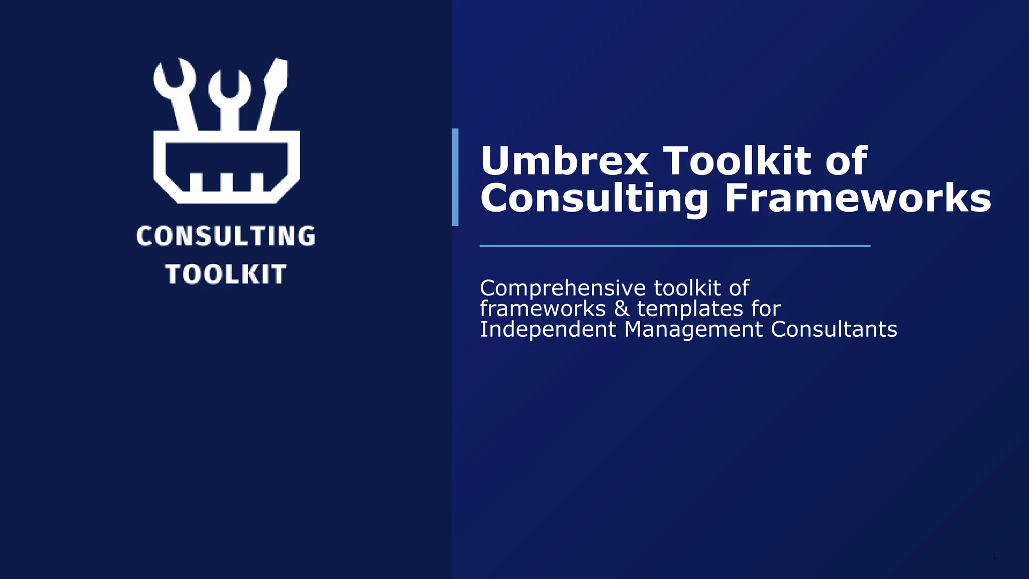 The document outlines the Umbrex toolkit, a comprehensive resource for independent management consultants, featuring over two dozen business frameworks and templates. It includes application guidelines for using various frameworks such as Porter's Five Forces, BCG Growth Share Matrix, and McKinsey 7-S Framework, along with additional consulting resources and services offered by Umbrex. Additionally, it highlights the advantages of collaborating with top-tier independent consultants and provides educational resources for building and managing a consulting practice.