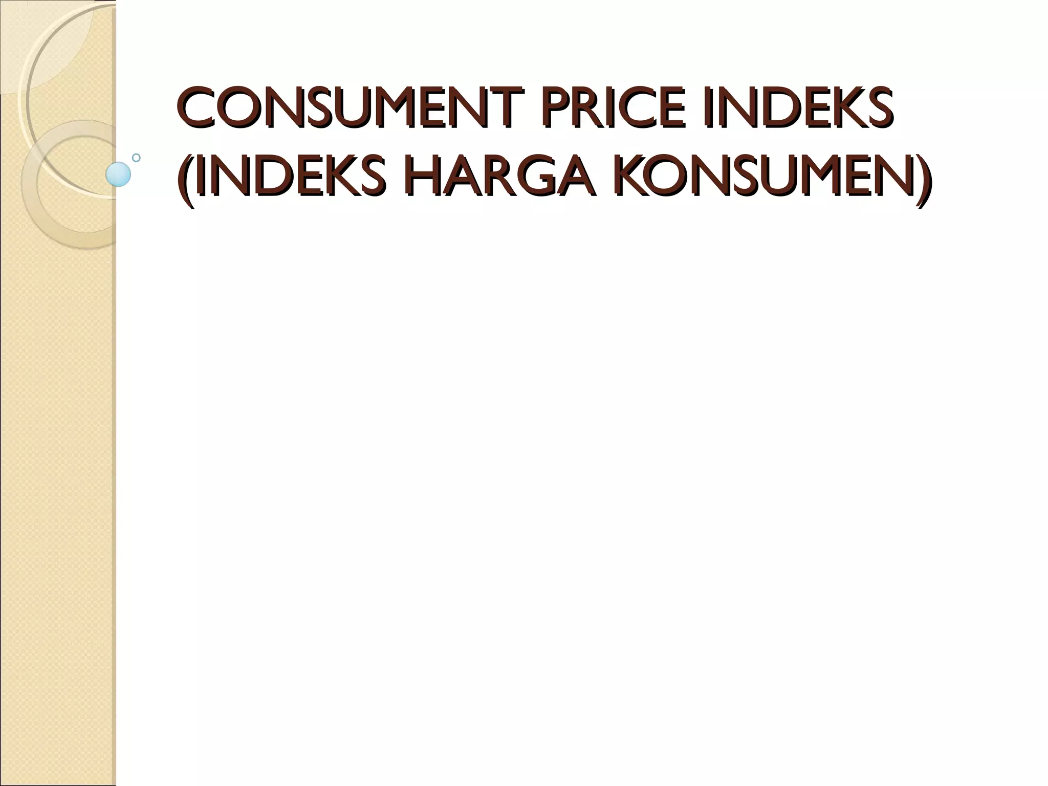 Indeks Harga Konsumen (IHK) mengukur biaya barang dan jasa yang dibeli oleh rata-rata konsumen dan menjadi indikator inflasi. Inflasi dapat menyebabkan penurunan kesejahteraan rakyat dan hiperinflasi jika terus berlanjut, seperti yang terjadi di Indonesia pada tahun 1960-an. Alternatif untuk menghitung inflasi termasuk Indeks Harga Perdagangan Besar dan PDB Deflator.
