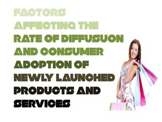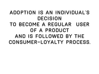 The document discusses the consumer adoption process for new products, which involves 5 stages: awareness, interest, evaluation, trial, and adoption. It also examines factors that influence consumers' adoption decisions such as the innovation's advantages, compatibility, complexity, ability to try it, and visibility of results. Finally, it notes that an organization's willingness to adopt innovations depends on variables like income, size, profits, and pressure to change.