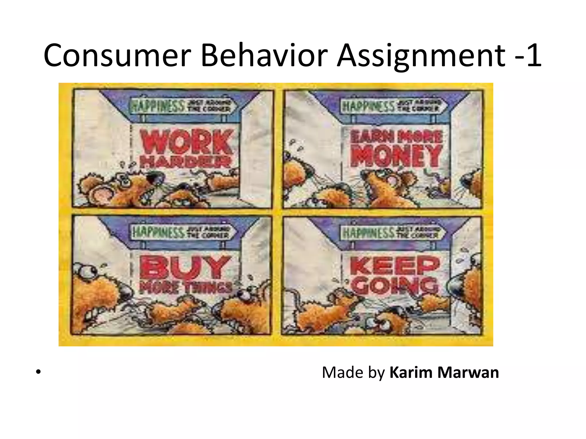 This document discusses consumer behavior and Maslow's hierarchy of needs. It mentions physiological needs like food and safety, as well as family, achievements, and creativity as part of Maslow's hierarchy. The document was created by Karim Marwan for a consumer behavior assignment.