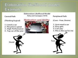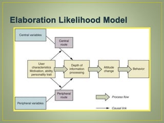 A theory thatsuggests that a person’s level of involvement during ,message processing is a critical factor in determining which route to persuasion is likely to be effective.(see also central and peripheral routes to persuasion. Central Route & peripheral route The central route is particularly relevant to attitude change when consumer’s motivation or ability to assess the attitude object is high(high involvement products) Peripheral Route consumer less motivated to think, learning through repetition, visual cues, holistic perception.