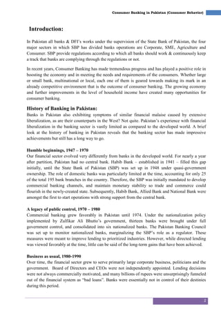 1) Consumer banking in Pakistan has grown tremendously in recent years and plays an important role in the economy. It began with humble beginnings after partition and underwent periods of nationalization and privatization.