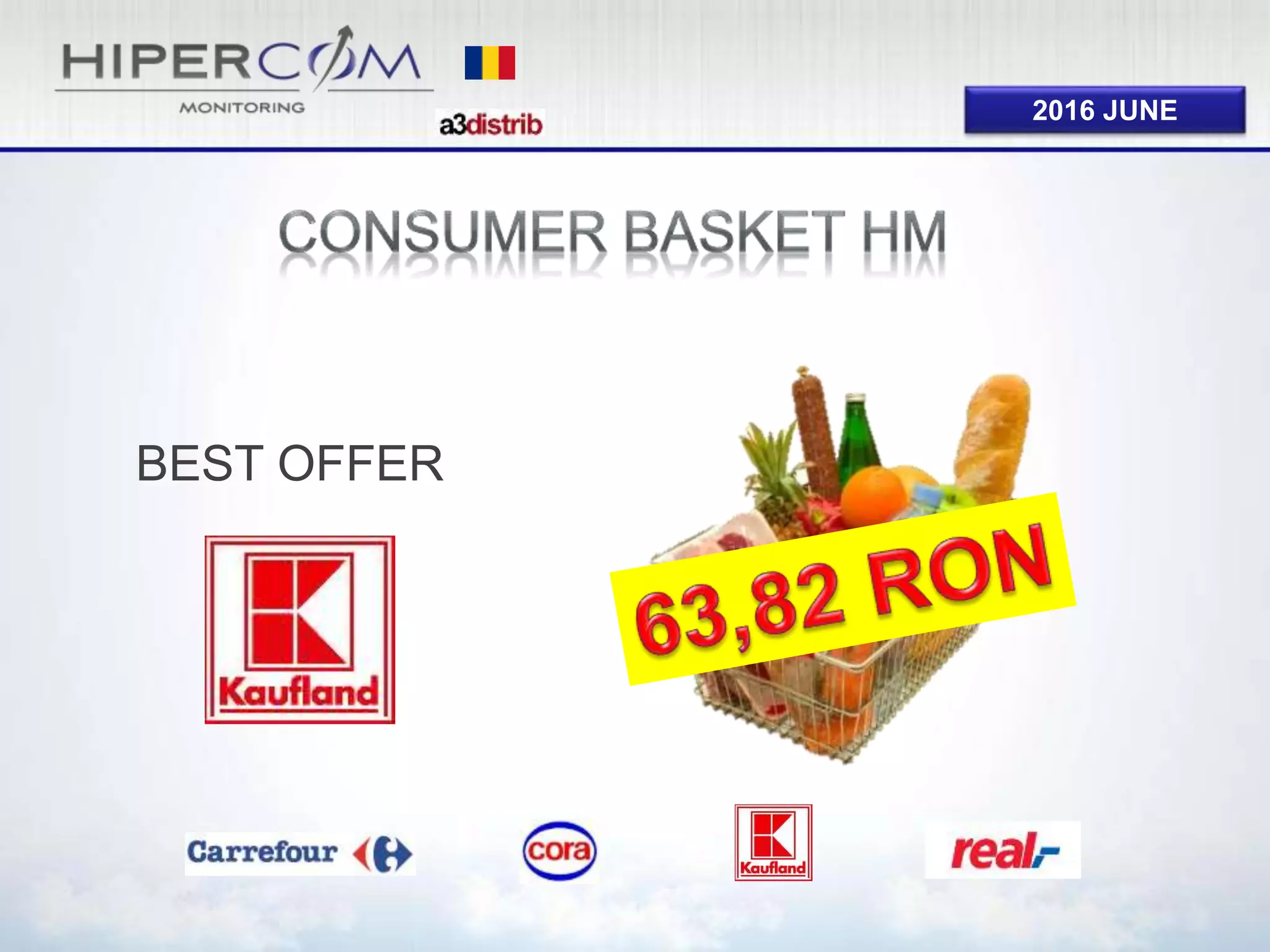 The document compares the prices of 11 common grocery products from 4 Romanian retailers (Cora, Kaufland, Real, Carrefour) in June 2016. It finds that Kaufland had the lowest total basket price of 63.82 RON. For products not on promotion, average 2015 prices were used. Carrefour would have had the lowest basket price of 59.58 RON if all products were promoted. Price differences between retailers for individual products like sparkling water, flour, and eggs are also shown.