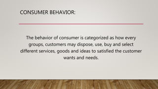 The document discusses factors that influence consumer behavior. It identifies three main factors: psychological factors like mental states and perceptions; personal factors such as individual characteristics, culture, and lifestyle; and social factors including social groups, family, education, and income. Consumer behavior is shaped by these internal and external influences and varies between individuals and groups when selecting and using products.