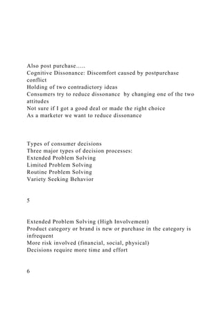 El comportamiento del consumidor se refiere a la forma en que los individuos y hogares compran bienes y servicios para consumo personal. Existen distintos tipos de procesos de decisión del consumidor, como la solución de problemas extendida y limitada, que varían según el nivel de involucramiento y riesgo asociado a la compra. Factores como la motivación, la personalidad, la percepción y las influencias socioculturales impactan en el comportamiento del consumidor y son relevantes para las estrategias de marketing.