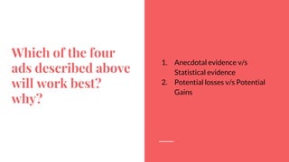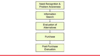 The document discusses consumer behavior related to health awareness campaigns, comparing anecdotal and statistical evidence in advertising, with potential losses framed as more persuasive than gains. It outlines the decision-making process for disease testing, emphasizing the importance of triggering problem recognition and the sources of information consumers use. Additionally, it highlights various marketing strategies, including social media campaigns and reference groups, to encourage breast cancer testing and awareness in the Indian market.