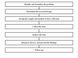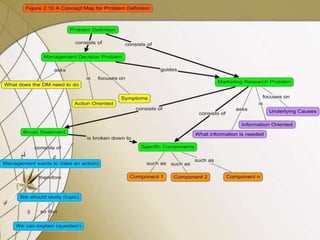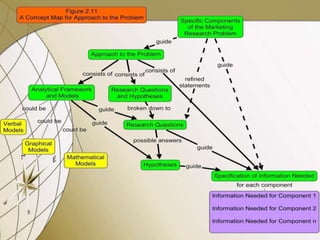 Marketing research involves systematically collecting, recording, and analyzing data to solve marketing problems. It has two main components - marketing and research. Marketing refers to creating value for customers, while research refers to a scientific study of a problem. There are three main steps to the marketing research process: 1) defining the problem, 2) designing the research, and 3) collecting and analyzing data. Problem definition involves understanding the client's needs, environment, and objectives. Research design specifies the methodology, including what data is needed and how it will be collected and analyzed. Overall, marketing research links customers and markets to organizations through insights gleaned from a systematic process.