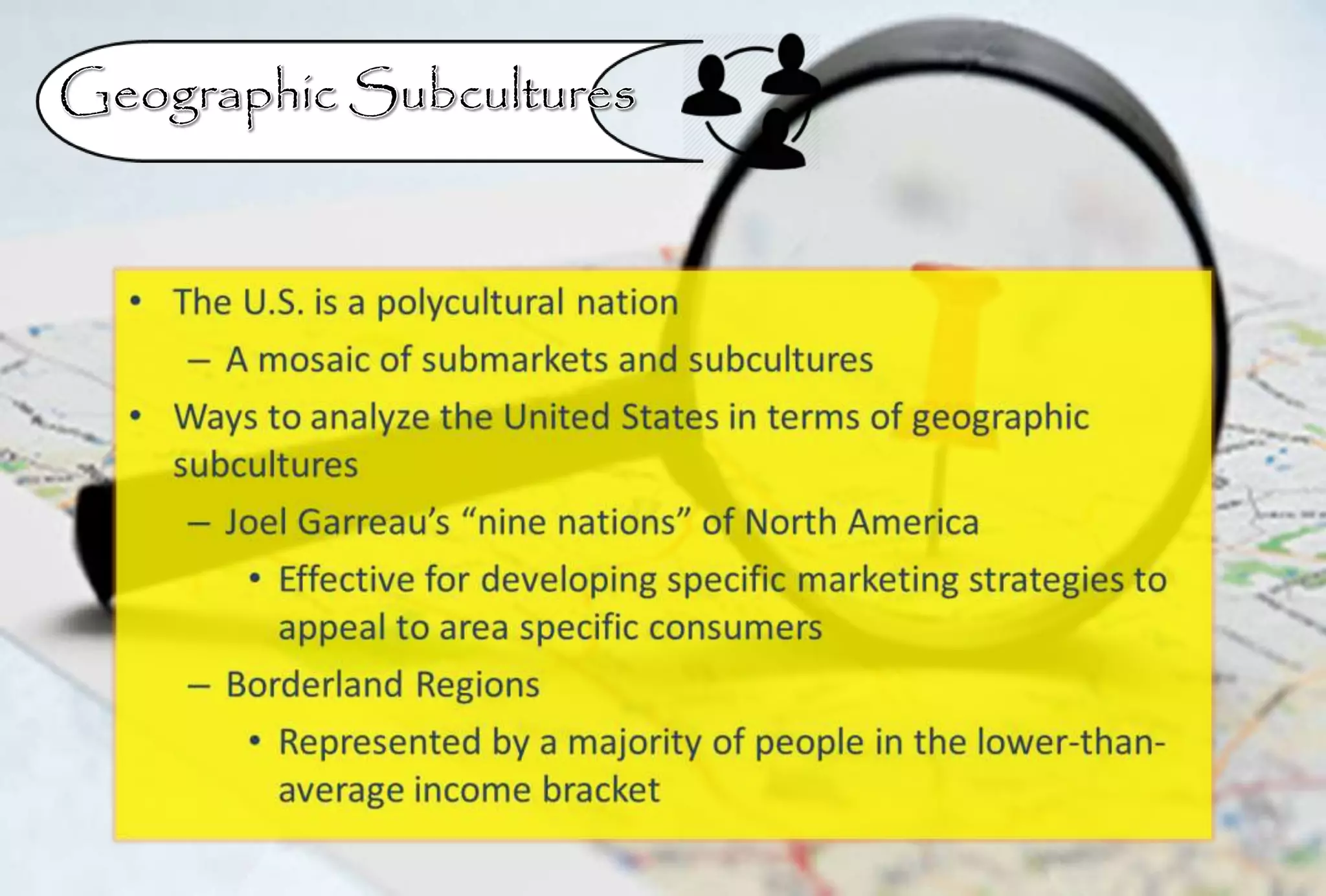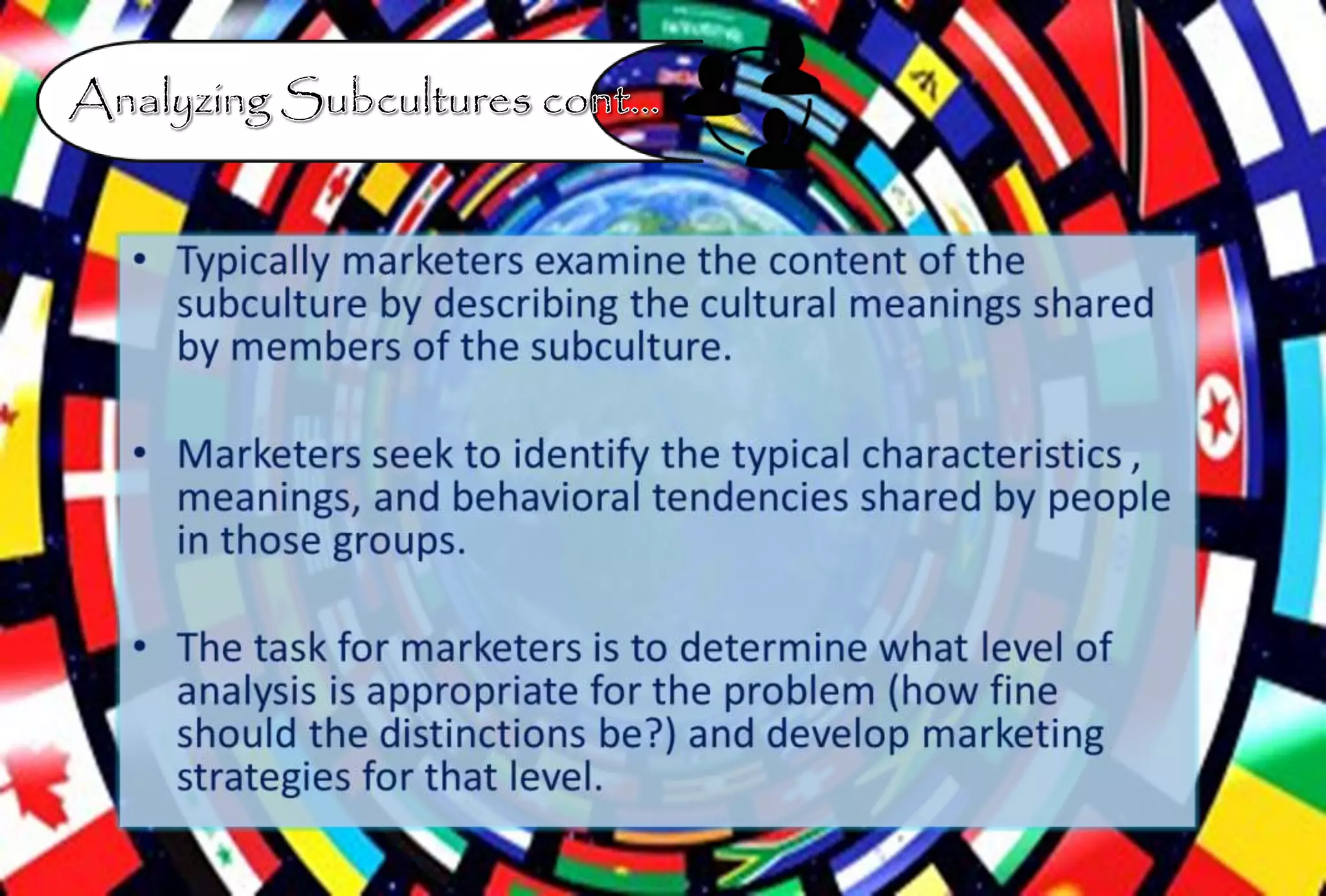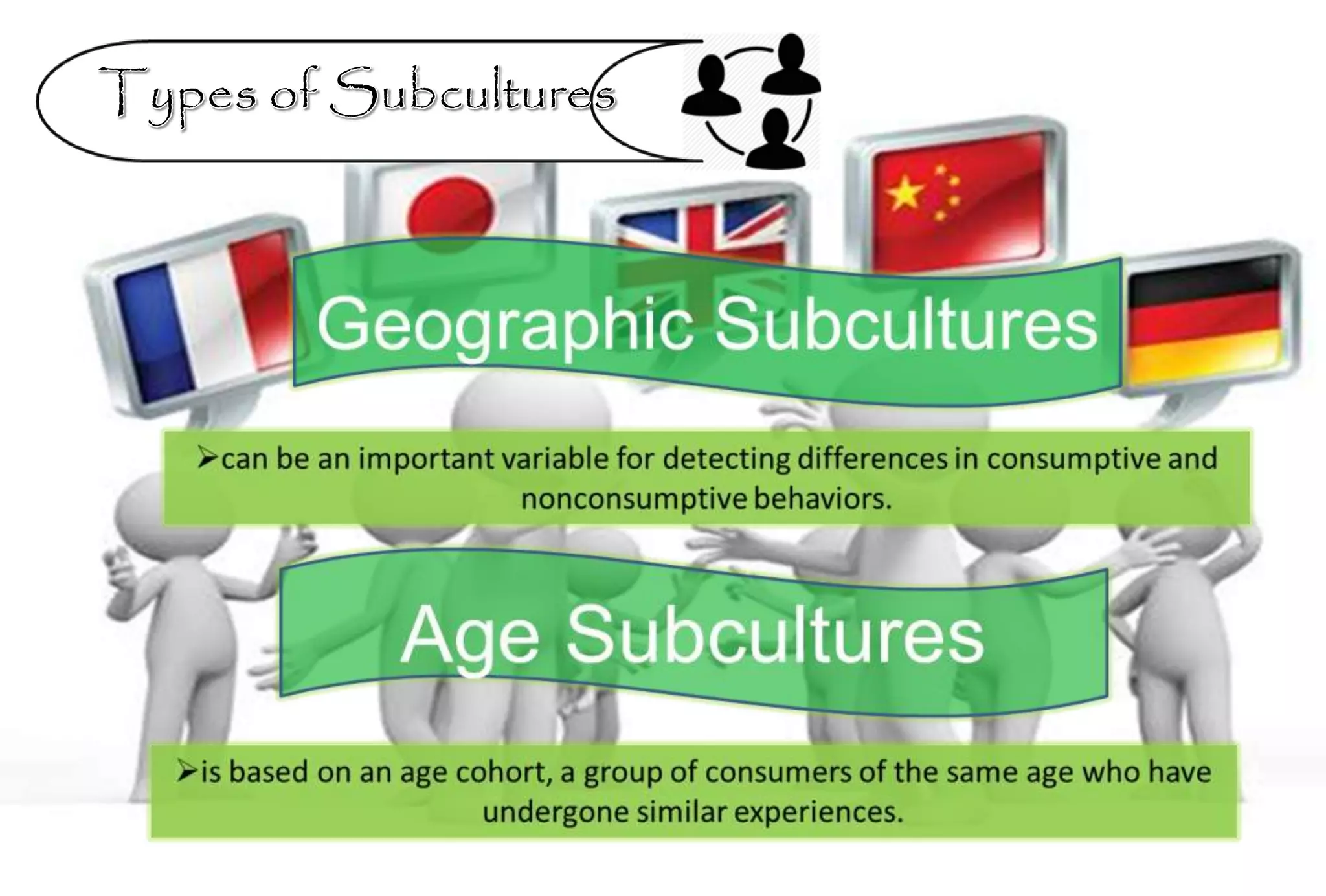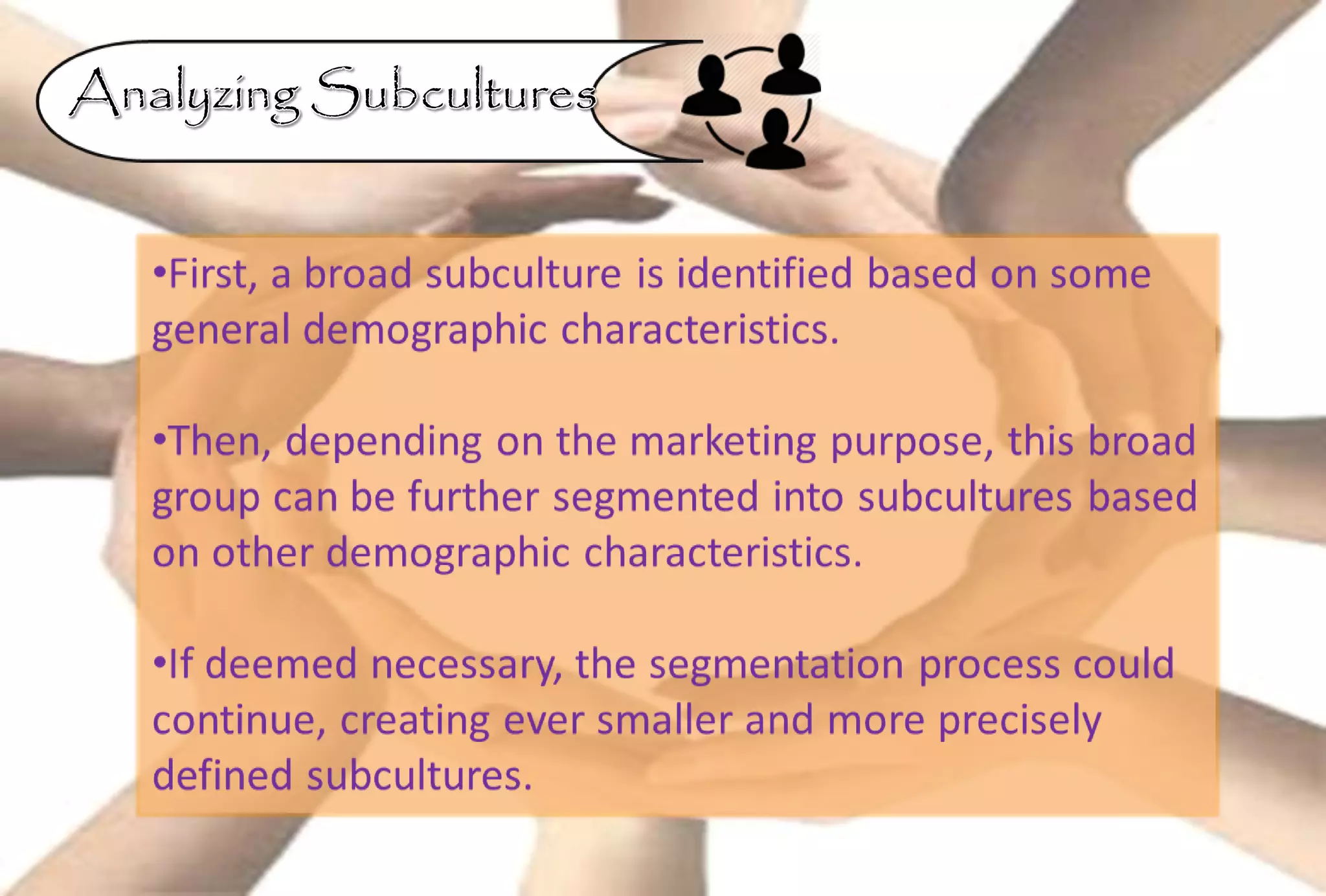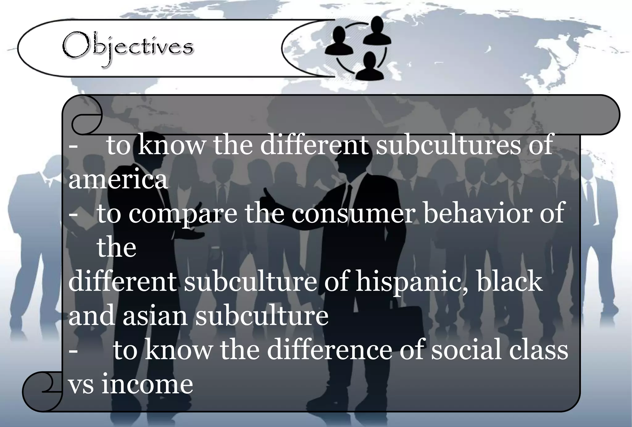 This document discusses consumer subcultures and social classes in the United States. It identifies several key subcultures including age (dividing older consumers into categories), ethnicity (focusing on Black, Hispanic, and Asian subcultures), and gender. Income levels are used to define three social classes - upper, middle, and lower class. The relationship between social class and income in predicting consumer behavior is also examined.