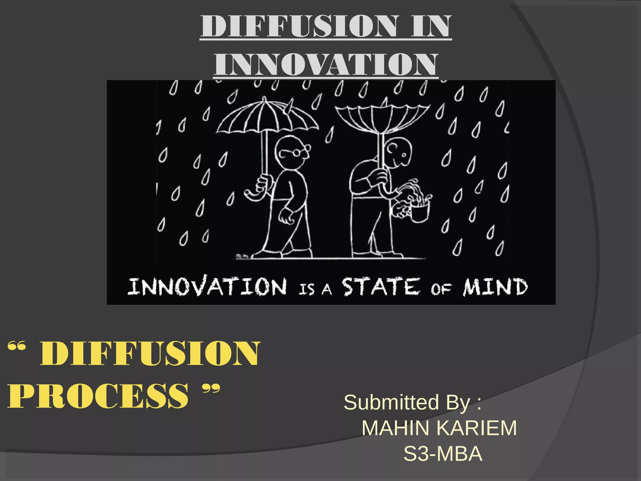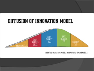 The document discusses diffusion of innovations theory, which seeks to explain how new ideas and practices are adopted over time. It involves two processes: diffusion, which is the spread of an innovation from its source to consumers, and adoption, which refers to a consumer's decision to accept or reject an innovation. Key aspects of diffusion include the innovation itself, communication channels, the social system, and the passage of time. Adoption depends on factors like an innovation's relative advantage, compatibility, trialability, observability, and complexity. The document also examines characteristics of innovators, early adopters, and other categories of adopters.