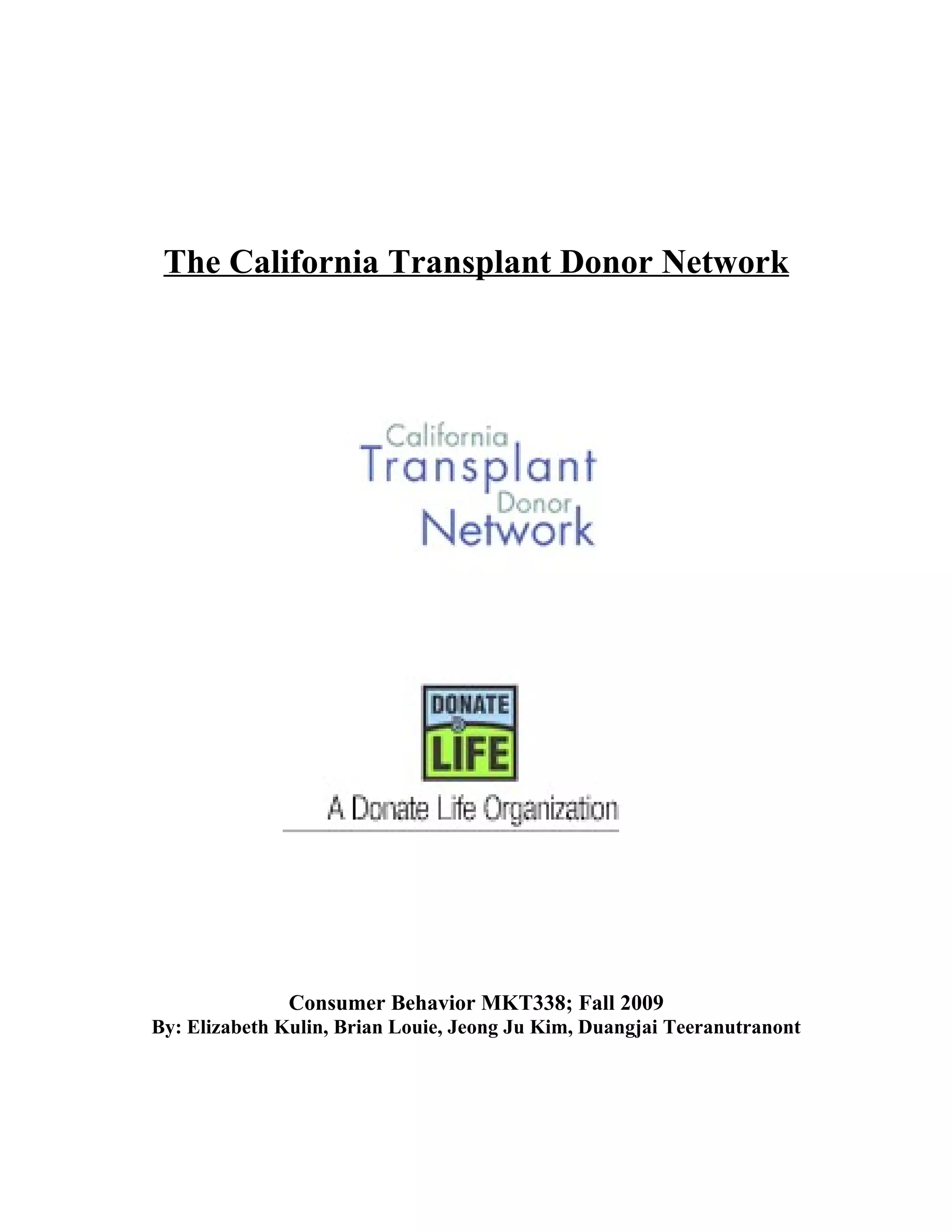 The document discusses a marketing plan and strategy developed by a group of students for The California Transplant Donor Network to increase organ donation rates among African Americans. The plan identifies key problems such as fear of participation, confusion about the opt-in process, and lack of motivation. It recommends targeting African Americans and proposes a multi-pronged marketing approach including cause marketing partnerships, outdoor advertising, using a celebrity spokesperson, and grassroots campaigns.