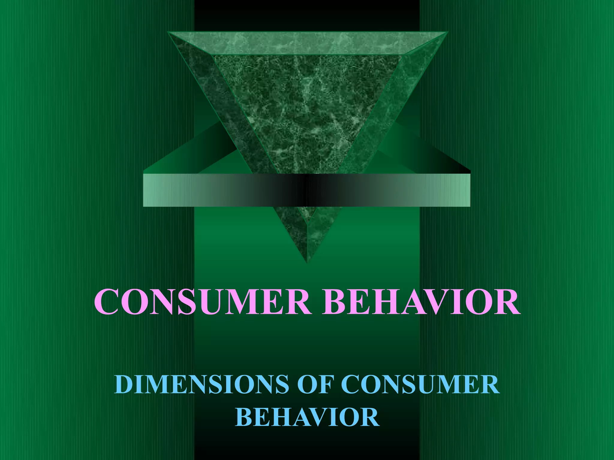 Consumer behavior involves how people buy goods and services, including what they buy, when they buy, and why. There are six stages to the consumer buying process: problem recognition, information search, evaluation of alternatives, purchase decision, purchase, and post-purchase evaluation. There are four types of consumer buying behavior: routine/programmed behavior, limited decision making, extensive decision making, and impulse buying. Consumer behavior aims to understand consumers and help marketers better meet consumer needs and wants.
