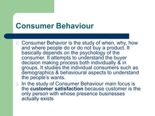 The document discusses consumer behaviour, which is defined as the study of how, why, when, and where people make purchasing decisions as individuals and in groups. It examines the factors that influence consumer decisions, such as psychological, social, cultural, and personal factors. The key aspects of consumer behaviour covered include the consumer decision-making process, motives for purchasing, and the importance of understanding consumer behaviour for business success.