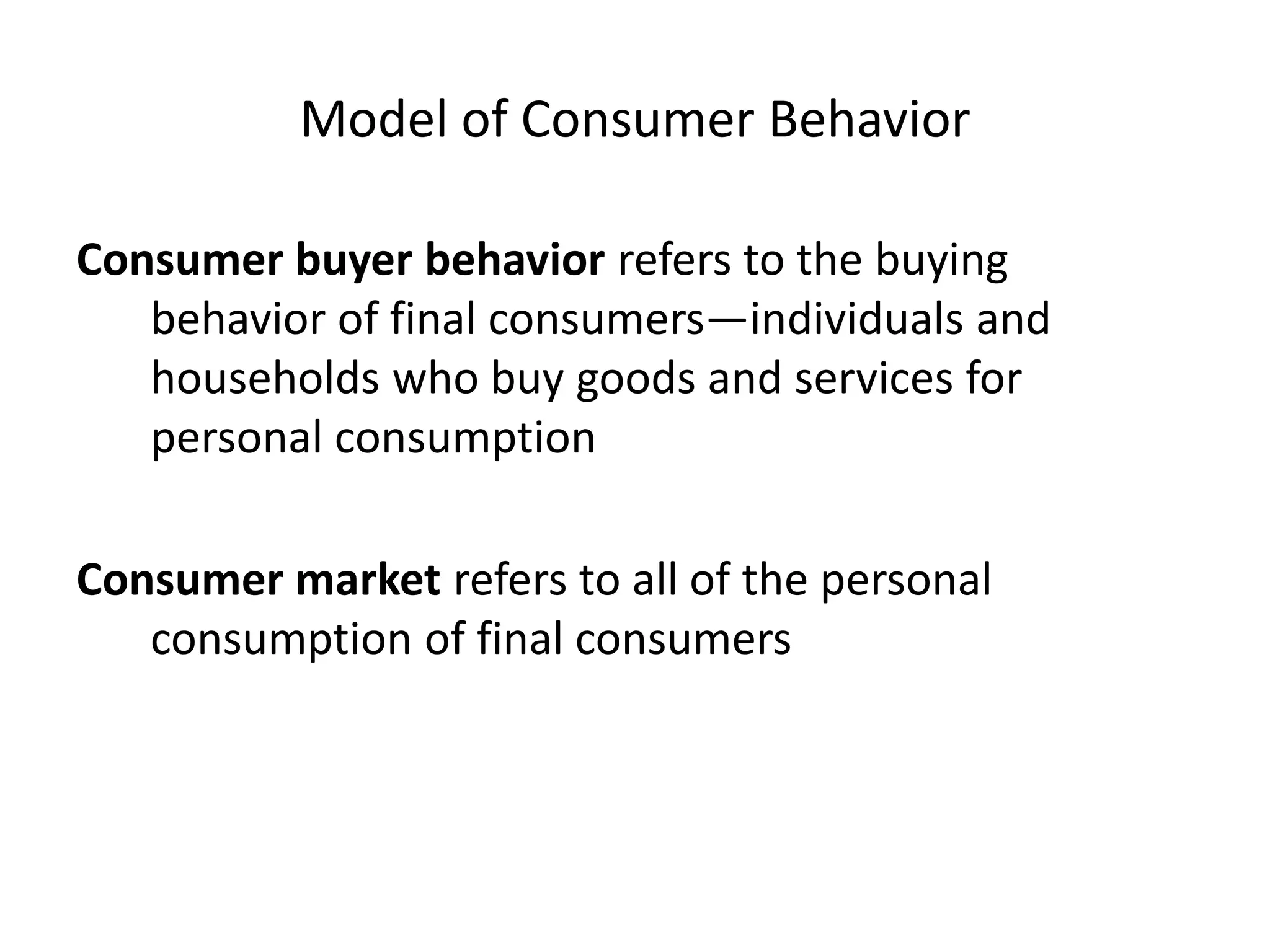 This document discusses consumer buyer behavior and the factors that influence purchasing decisions. It outlines the consumer decision process, which begins with need recognition and information search. The consumer then evaluates alternatives and makes a purchase decision. After purchasing, the consumer experiences post-purchase satisfaction or dissonance based on whether expectations match actual product performance. Key factors like culture, social class, personality, motivation, and perception shape how consumers move through the decision stages.