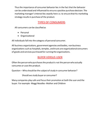 This document discusses consumer behavior and provides a model of factors that influence it. It defines consumer behavior as acts of obtaining, using, and disposing of goods and services, including the decision processes involved. A simple model of consumer behavior is presented showing external influences and marketing stimuli affecting the consumer decision making process and resulting in consumer decisions and actions. A more detailed model then outlines various personal, psychological, social, and cultural factors that shape consumer behavior, such as age, gender, motivation, perception, learning, beliefs, attitudes, and reference groups.