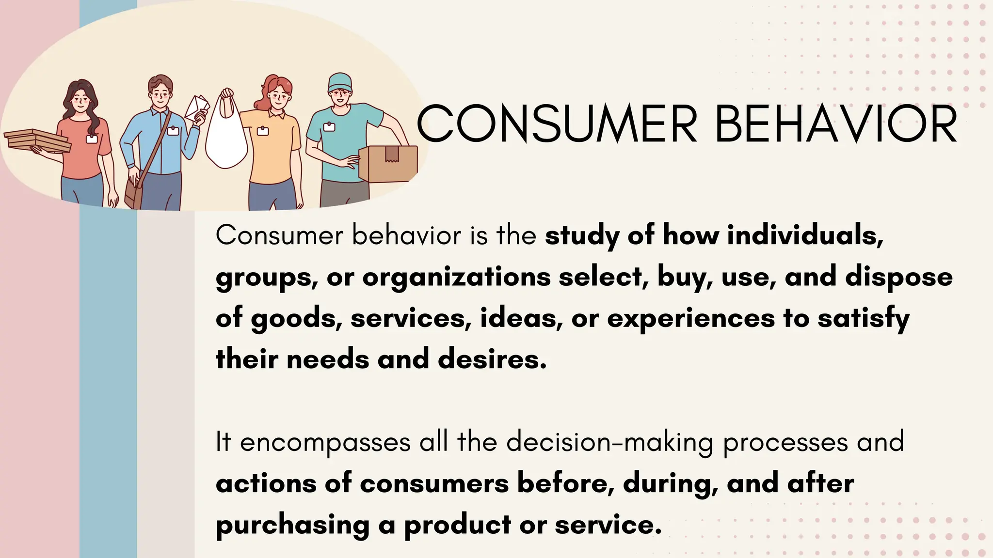 Consumer behavior examines how individuals and groups make decisions to purchase and use products or services to satisfy needs. It involves understanding the decision-making process, psychological and personal influences, and cultural and social factors that affect consumer choices. The document also outlines types of buyer behavior and marketing implications for effectively reaching and engaging consumers.