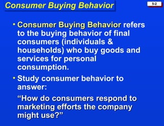 The document discusses consumer buying behavior and the factors that influence consumer purchase decisions. It outlines a simple model of consumer behavior involving marketing stimuli, the buyer's black box of characteristics and decision making processes, and the buyer's response. It then discusses the psychological, social, cultural, and personal characteristics affecting consumer behavior and lists the stages in the buyer decision process.