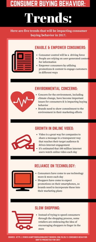 The document outlines five trends influencing consumer buying behavior in 2017, emphasizing consumer control, environmental concerns, slow shopping, the growth of online video, and reliance on technology. It highlights the importance of user-generated content and marketing strategies that engage consumers while addressing their environmental concerns. Brands are urged to adapt to these trends by enhancing their marketing efforts to align with consumer expectations and behaviors.