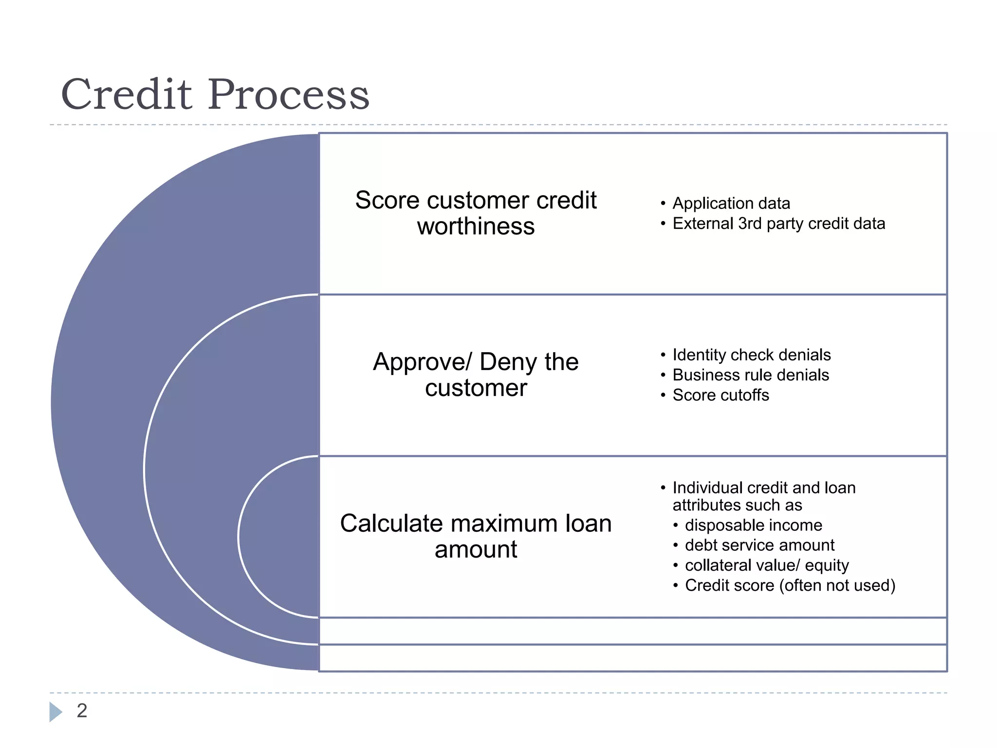 The document outlines a framework for consumer credit risk analytics, emphasizing the importance of customer credit scoring, approval rate determination, and effective credit limit setting. It critiques traditional methods, suggesting a shift towards using Vintage-Age Customer Value (VAV) for better insights into credit risk and overall customer valuation. The proposed approach aims to enhance decision-making processes in credit approval and limit setting by basing they on a more comprehensive analysis of customer value rather than simplistic good/bad indicators.