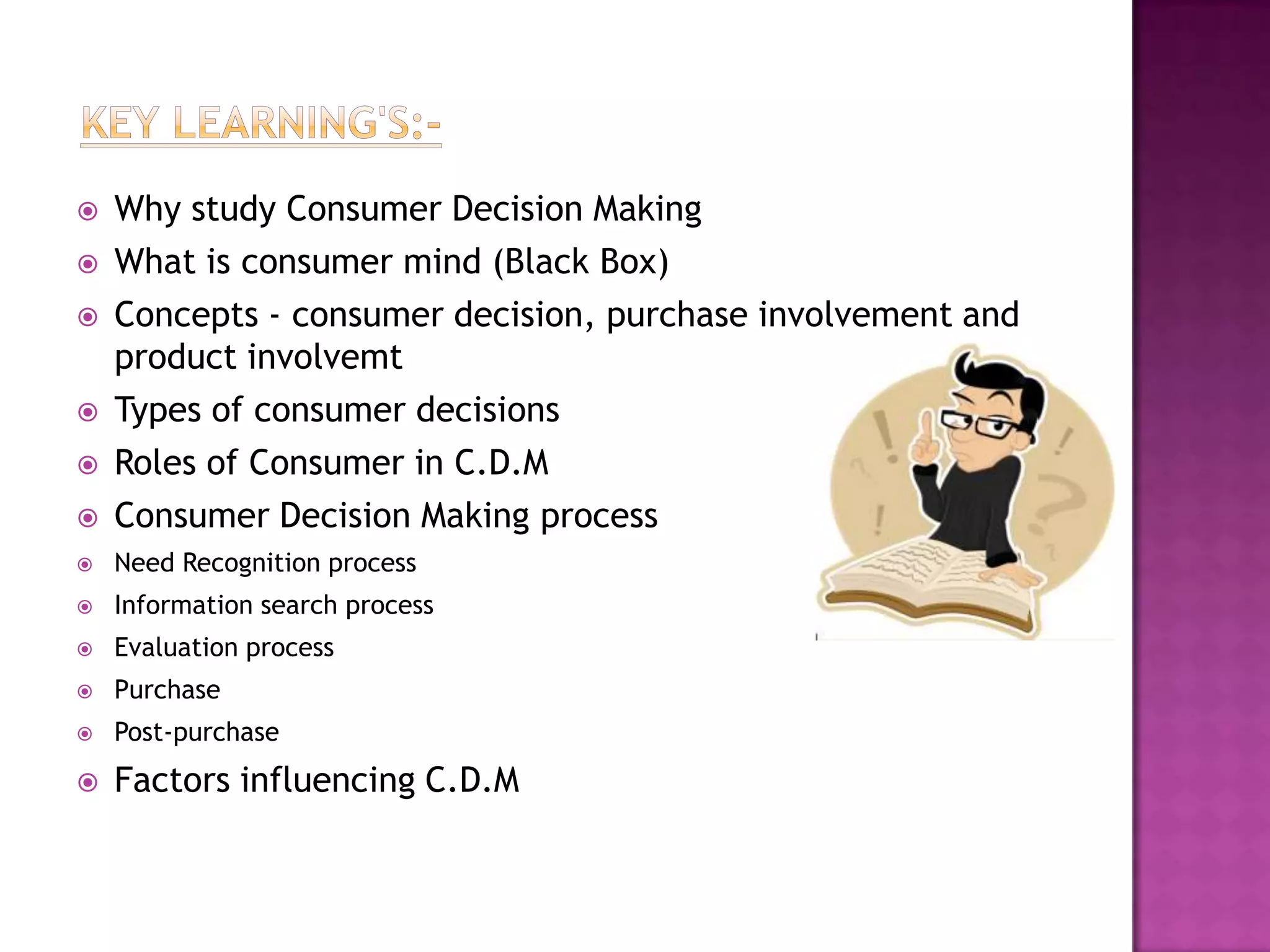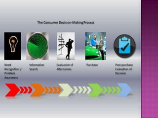 The document discusses consumer decision making. It outlines the consumer decision making process which includes need recognition, information search, evaluation of alternatives, purchase, and post-purchase evaluation. It also discusses the types of consumer decisions and factors that influence consumer decision making like marketing efforts, psychological factors, and socio-cultural environment. The goal is to understand the "how" and "why" of consumers' experiences with products and services.