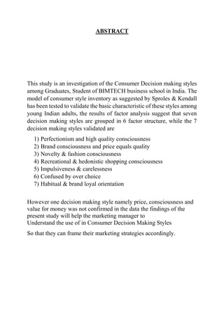 The document investigates consumer decision-making styles among first and second-year students at BIMTECH related to mobile phone purchases, identifying seven primary styles grouped into six factors derived from the Consumer Style Inventory. The study aims to help marketing managers tailor their strategies based on these styles, emphasizing the importance of understanding consumer behavior and preferences. A survey involving various factors influencing purchasing decisions was conducted, employing factor analysis to validate the findings.