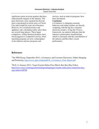 This document analyzes the consumer electronics industry using Porter's Five Forces model. It finds that the threat of new entrants is high due to the capital intensive nature of opening stores and established brands. The bargaining power of suppliers is also high given major suppliers account for most of the largest retailer's merchandise and have alternative distribution options. Additionally, the bargaining power of buyers has increased as e-commerce allows for price transparency and low switching costs. Substitutes like online retailers and other big box stores carrying electronics provide alternatives. Finally, rivalry in the industry is intense as competitors match prices aggressively and introduce new programs to attract customers.