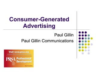 The document discusses consumer-generated advertising (CGA) and its growing influence, highlighting the need for brands to engage consumers authentically and creatively. Although CGA provides opportunities for innovation and connection, it also poses risks such as loss of control and dilution of messaging. Key insights include the importance of memorable storytelling, genuine engagement, and the varying levels of consumer participation in content creation.