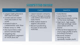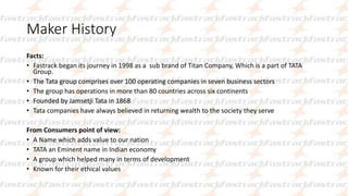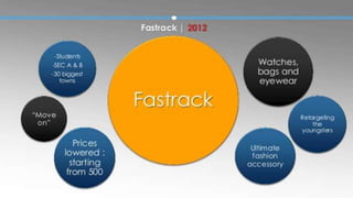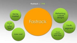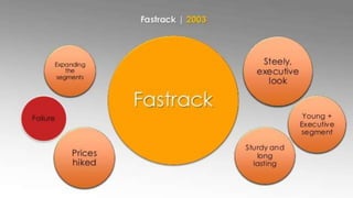 Fastrack began in 1998 as a sub-brand of Titan, which is part of the Tata Group. It is known for trendy, stylish watches that are good value for money. Fastrack targets youth aged 18-30 and competes with brands like Timex and Casio. It distributes products through 137 showrooms and online retailers. Marketing emphasizes Fastrack's edgy design and affordable pricing to appeal to its young customer base. Communication includes television, print, and mall activations, often with promotional pricing around festivals.