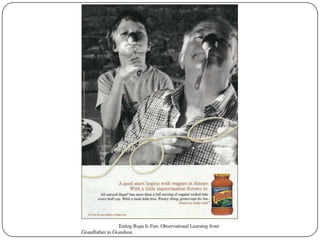 Consumer learning involves acquiring knowledge about products and consumption through experience, observation, and interactions over time. This knowledge then impacts future purchasing behaviors. There are four key elements of consumer learning: motives (needs and drives), cues (stimuli), responses, and reinforcement (rewards). Marketers seek to understand these elements to most effectively teach consumers how their products can fulfill needs. Common forms of consumer learning discussed include classical conditioning, instrumental conditioning, observational learning, and information processing. Marketers measure the results of consumer learning through outcomes like recognition, recall, brand loyalty, and brand equity.