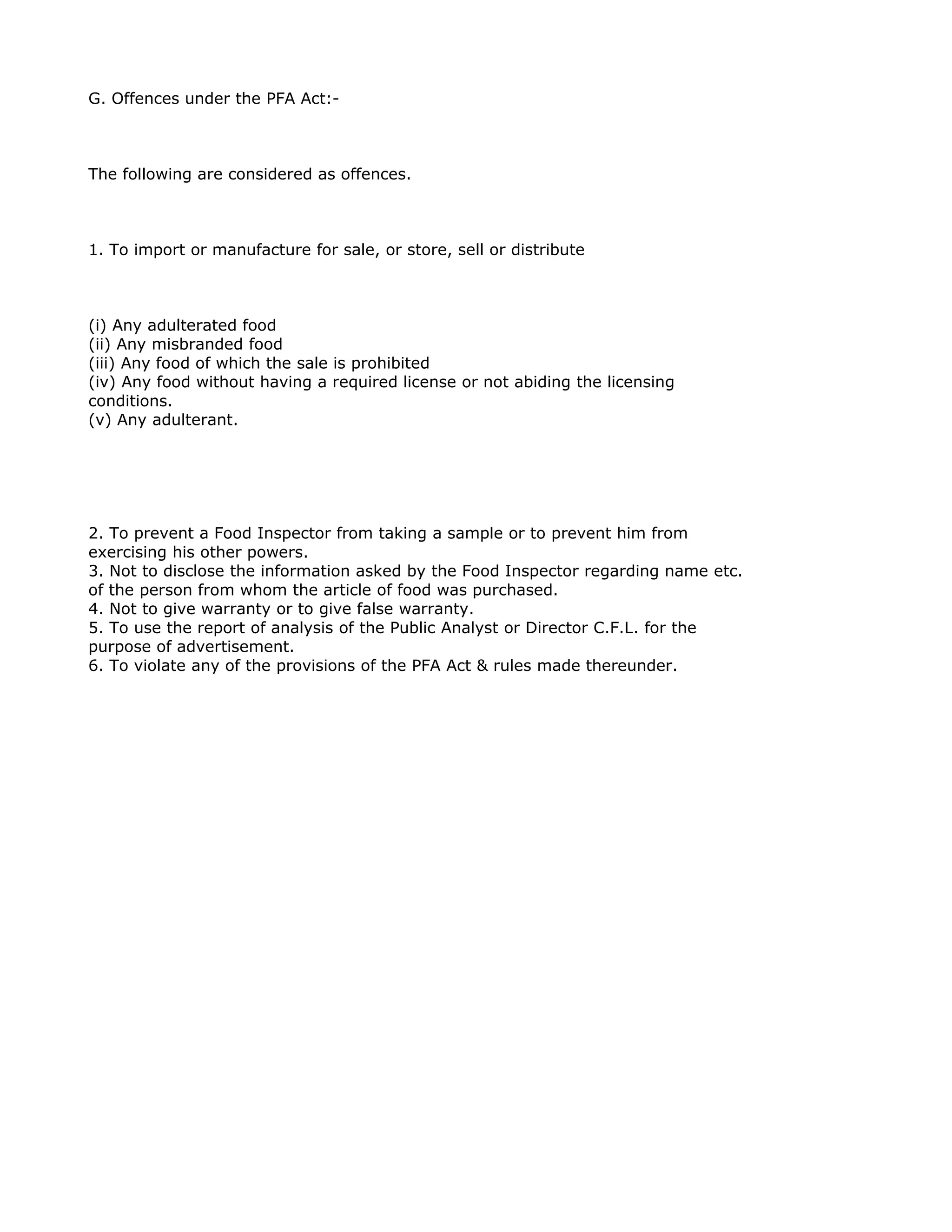 The document outlines offenses and powers under the Prevention of Food Adulteration (PFA) Act in India.