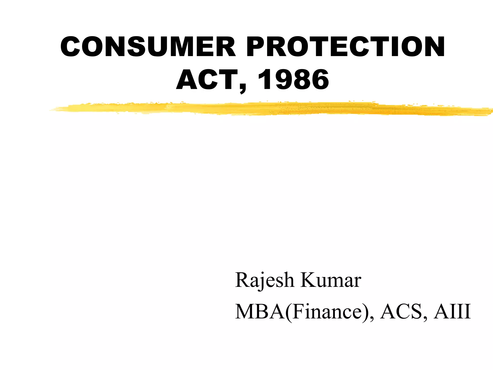 The document summarizes the key aspects of the Consumer Protection Act of 1986 in India. It outlines the objectives of protecting consumers' health, economic interests, and rights. It defines who constitutes a consumer and discusses unfair/restrictive trade practices, defects, excessive pricing, and hazardous goods. The legislation established forums for consumers to file complaints within 2 years, seeking remedies such as removal of defects, refunds, replacements or compensation for issues with goods or services within 90 days.
