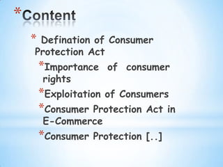 The document discusses consumer protection and consumer rights. It defines consumers and discusses the importance of protecting consumers from exploitation through unfair trade practices. It outlines several key consumer rights like the right to safety, the right to be informed, and the right to choose. The document also discusses unfair and restrictive trade practices that harm consumers as well as the role of businesses, government, and consumers themselves in ensuring effective consumer protection.