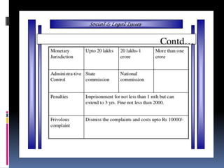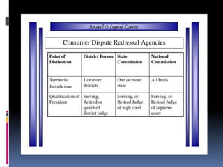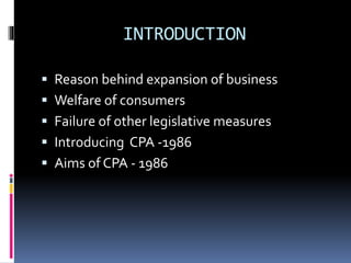 The Consumer Protection Act of 1986 was passed to protect consumer rights and welfare in India. It aims to establish consumer councils at the district, state, and national levels to address complaints related to defective goods, unfair trade practices, and deficient services. The Act defines a consumer as an individual who purchases goods or services for personal use rather than for manufacturing or resale. It gives consumers various rights such as the rights to safety, to be informed, to choose, to consumer education, and to redressal. Complaints can be filed by individual consumers, recognized consumer associations, groups of consumers with common interests, or government bodies.