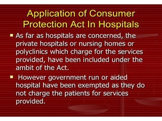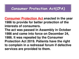 The Consumer Protection Act is a law enacted to safeguard the rights and interests of consumers in India. Originally passed in 1986 and later updated in 2019, the Act aims to protect consumers from unfair trade practices, defective goods, and deficient services. It ensures the right to safety, information, choice, redressal, and consumer education. The Act provides a legal framework for the establishment of consumer courts at the district, state, and national levels, enabling quick and effective resolution of complaints. The updated Act also introduced e-filing of complaints, product liability, and stricter penalties, making it more relevant in the age of online shopping and digital transactions.