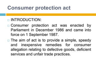 The document discusses consumer protection laws and patient rights in India. It provides definitions of key terms like "consumer", "complaint", and "defect" under the Consumer Protection Act. It describes the objectives and composition of Central and State Consumer Protection Councils. The document also outlines some of the fundamental rights that make up a Patient's Bill of Rights, such as the right to privacy and informed consent. Finally, it discusses laws in India related to children's rights and protection, including those prohibiting child labor and child marriage.