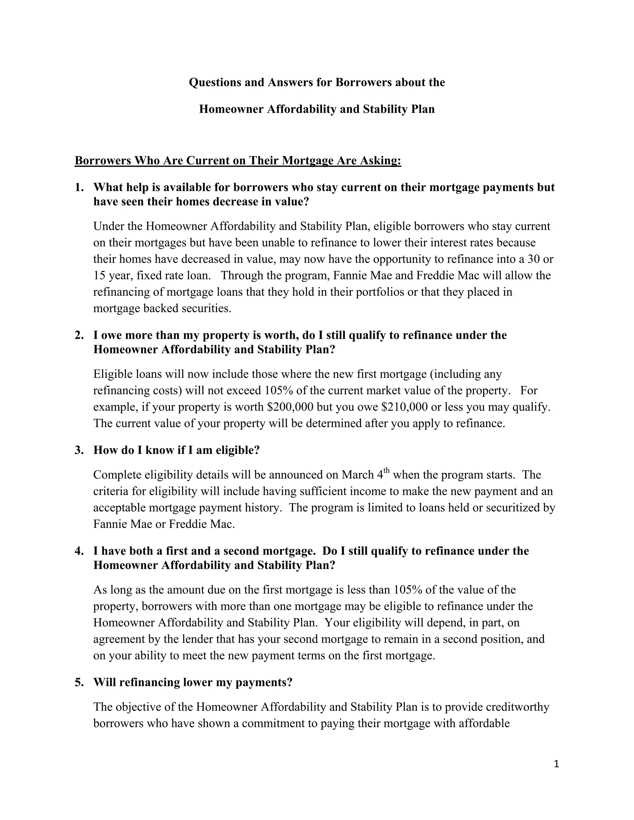 The document provides answers to questions about the Homeowner Affordability and Stability Plan, which aims to help homeowners refinance or modify their mortgages to more affordable terms. It addresses questions for borrowers who are current or at risk of foreclosure on their mortgages regarding eligibility, refinancing or modifying terms, costs, the application process, and what to do if facing foreclosure.