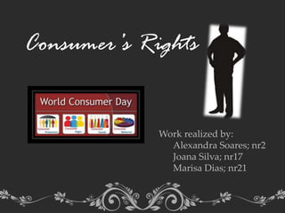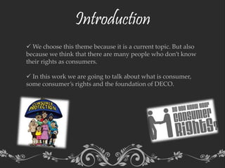 Consumer’s Rights discusses key rights of consumers such as the right to health and safety, quality goods/services, and protection of economic interests. It also outlines the founding and role of DECO, a Portuguese consumer protection organization established in 1974. DECO aims to inform consumers of their rights, handle complaints against companies, and advocate for consumers' interests by addressing harmful business practices. The document emphasizes that DECO provides various services and support to help educate and assist Portuguese consumers.