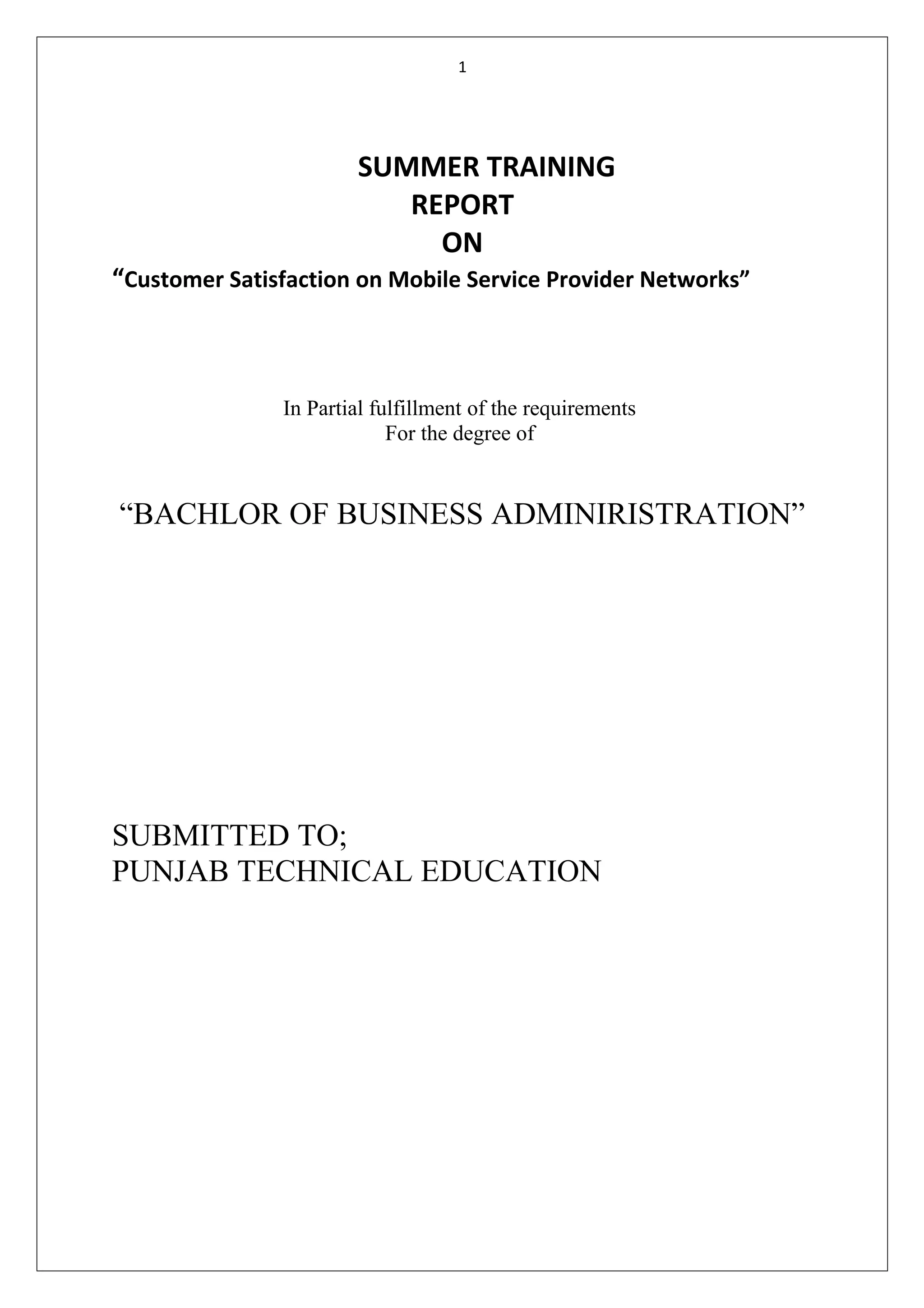 The document is a student's summer training report on customer satisfaction with mobile service providers in India. It includes an introduction describing customer satisfaction and factors that influence it. It also discusses the telecom industry in India, including key milestones in its evolution, current market shares of public and private operators, and the global cellular industry. The report will analyze customer satisfaction data collected through surveys to draw conclusions and suggestions.