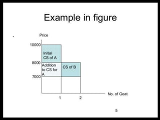 The document discusses consumer surplus (CS), defined as the difference between what consumers are willing to pay and what they actually pay, with key concepts including willingness to pay, Hicksian variations, and marginal utility. It also highlights the practical importance of CS in areas like public finance, monopoly pricing, international trade benefits, and cost-benefit analysis, while addressing measurement difficulties and criticisms regarding the concept's applicability, especially to necessities. Despite its challenges, consumer surplus remains a vital tool in economic policy formulation.