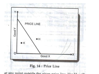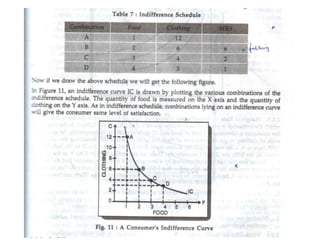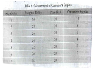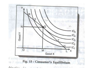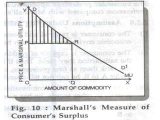 Consumer's surplus is the excess of the price that a consumer would be willing to pay for a good over the actual price paid, according to its originator Alfred Marshall. It is measured using indifference curve analysis, which maps consumers' preferences for different combinations of goods through indifference curves that depict equal levels of satisfaction. A consumer achieves equilibrium when their budget constraint is tangent to the highest possible indifference curve, where the marginal rate of substitution between two goods equals the ratio of their prices.