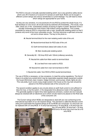 The document discusses consumer units, which distribute electricity to circuits in homes. It describes two main types - single load fuse boards and split load units. Split load units incorporate a residual current device (RCD) for additional safety, protecting vulnerable circuits from earth faults. The document provides detailed explanations and diagrams of how consumer units are configured and the purpose of their components.