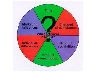The document discusses consumer behavior and the consumer decision-making process. It covers topics like need recognition, information search, purchase evaluation, and post-purchase behavior. It also discusses factors that influence consumer decisions at different stages, like cultural, social, individual, and psychological factors.